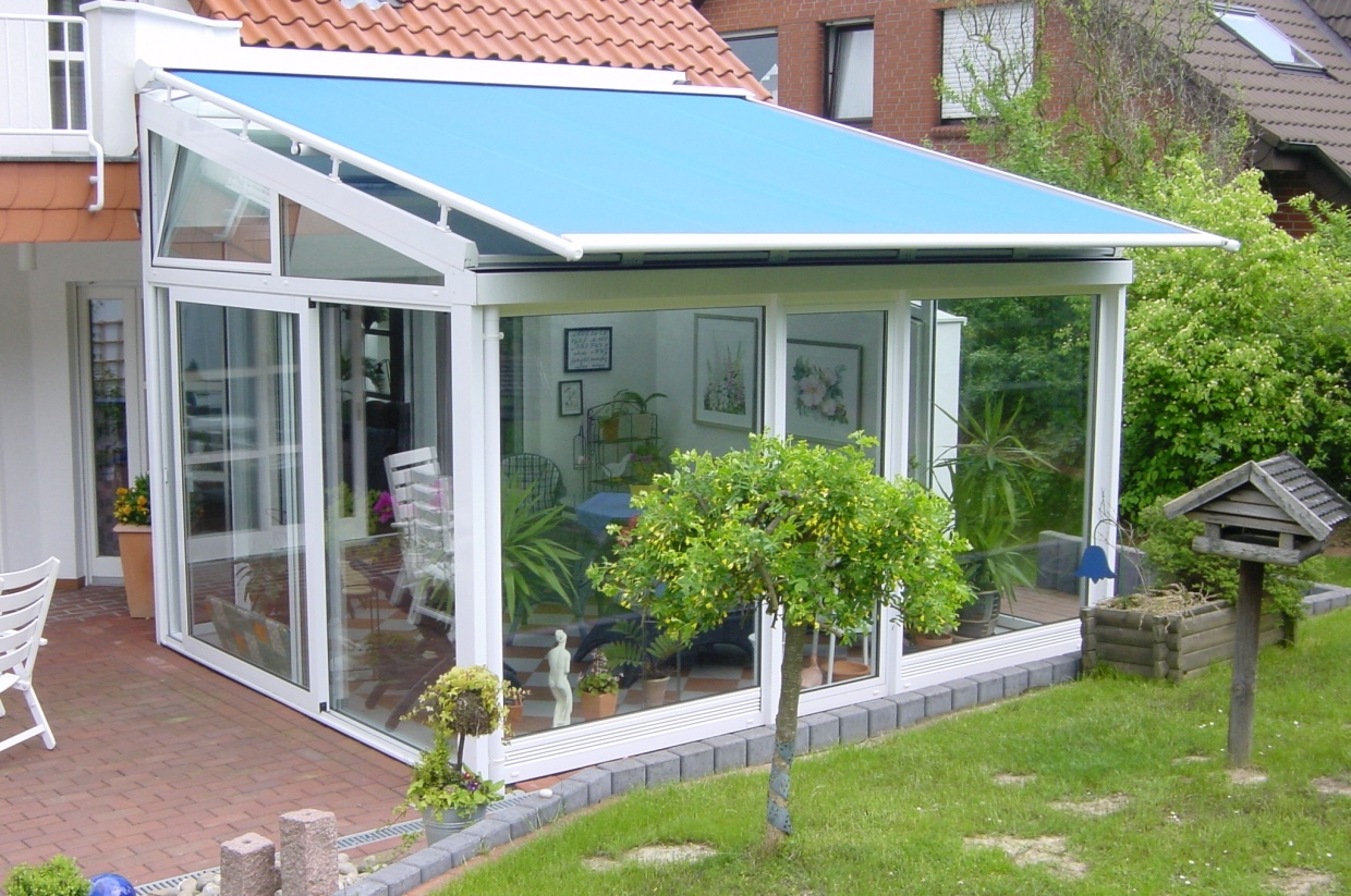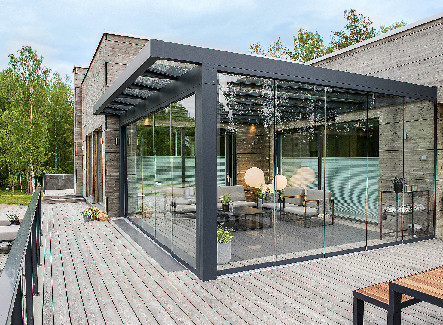 I eksemplet er Designline overdækningen forsynet med 4-fags skydedørsparti i alle 3 sider. Markise er monteret ovenpå taget.